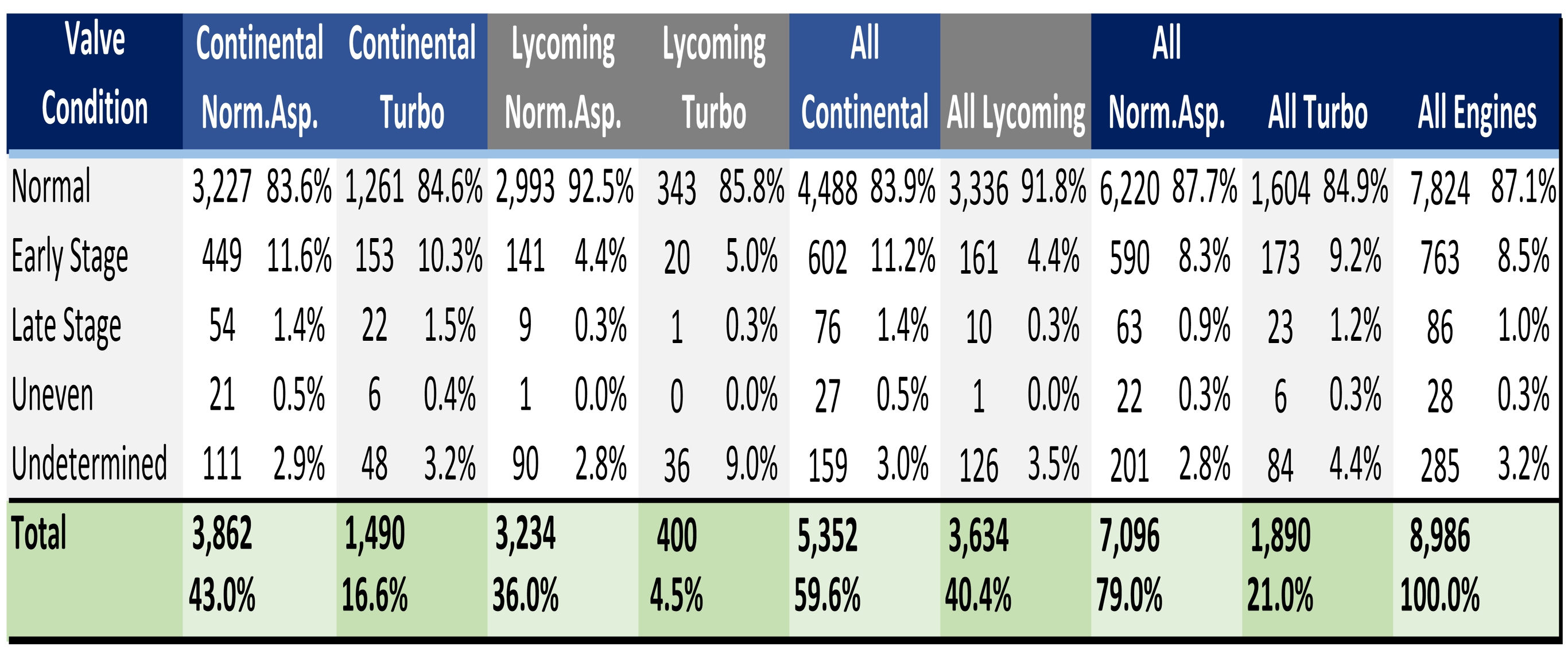 Figure 1 is the analytical spreadsheet showing the classification of 8,986 exhaust valves, including breakdowns by engine manufacturer (Continental and Lycoming) and by turbocharged vs. normally aspirated. There are an awful lot of numbers there to chew on, so I prepared a series of pie chars to illustrate the highlights.
