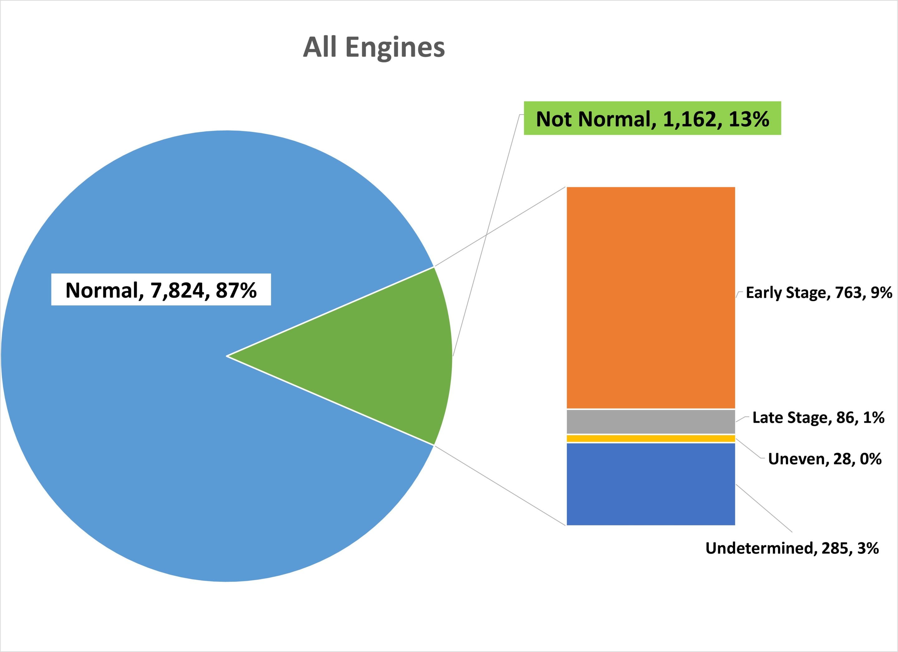 Figure 3 shows the breakdown of heat distress findings among all 9,000 exhaust valves we analyzed. Approximately 87 percent of them were classified as normal, 10 percent heat distress, and 3 percent undetermined. Of the heat-distressed valves, 87% were early-stage, 10% were late-stage, and 3% were uneven.