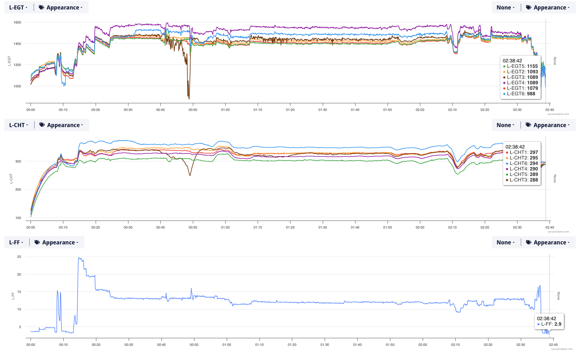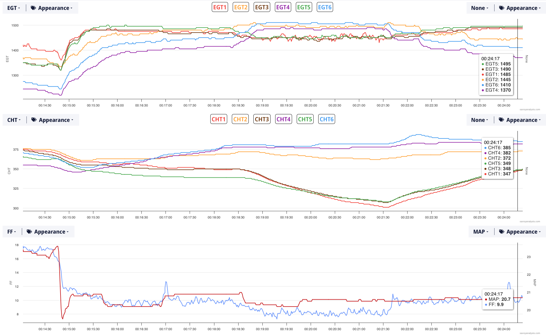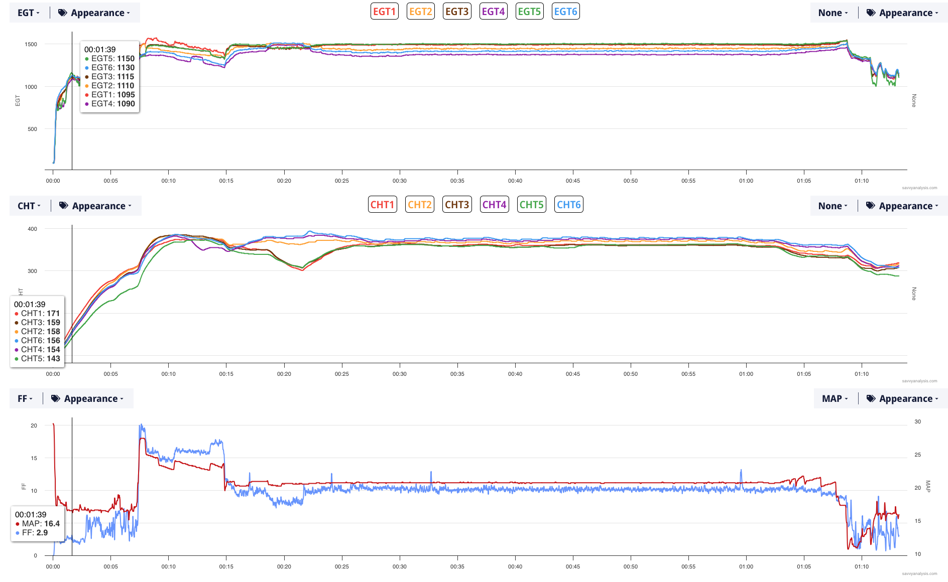 First up is a Cessna 182 powered by a Continental O-470 and data from a Garmin G3X with a 1 second sample rate. Here’s a typical cruise flight with EGTs, CHTs, FF and MAP. The owner had recently installed a SureFly mag and wanted us to review the data. As we saw in the governor story, one dangerous assumption is that since something was overhauled, it can’t possibly be causing the problem. Another dangerous assumption is that because something new was added, it must be causing the problem.