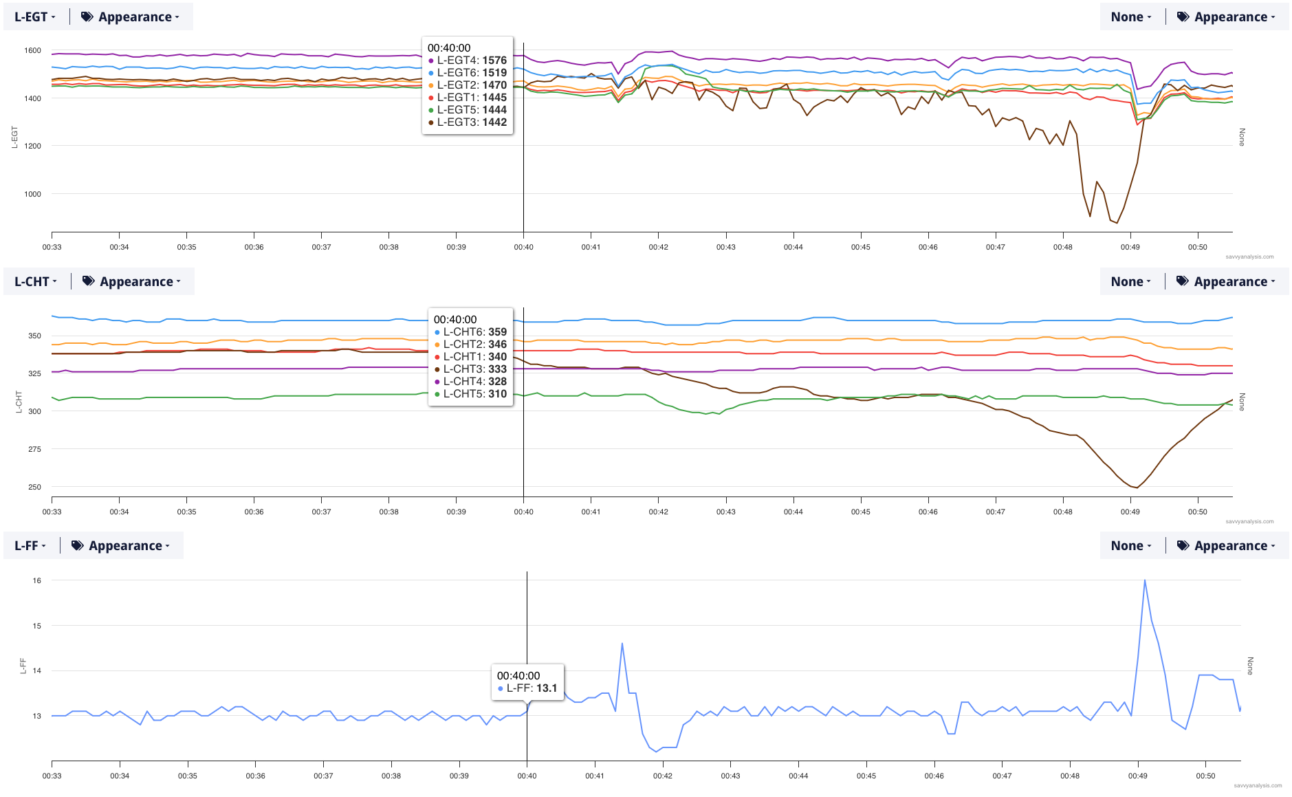 EGT 4 – the purple trace – is high throughout suggesting one of the plugs is not firing. EGT 6 – the cyan trace – jumps up at the 30 min mark suggesting one of those plugs fouled in flight. Then there’s the event with cylinder 3 – the brown trace – at the 40 minute mark. Let’s zoom in on that.